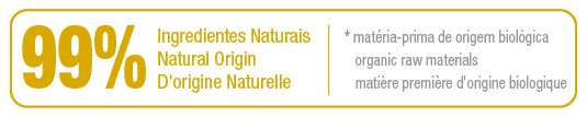 Na apresentação de cada produto, conseguirá encontrar a percentagem total dos ingredientes de origem natural e biológica em cada formulação, através do selo:
